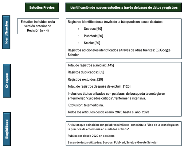 Los criterios de inclusión establecidos fueron: artículos científicos originales, revisiones sistemáticas en revistas indexadas y revisadas por pares, en español o inglés, que presentaban palabras similares del uso de la tecnología en la práctica de enfermería en cuidados críticos en sus títulos. Se excluyeron estudios que no estaban directamente relacionados con el tema, publicaciones anteriores a 2020, resúmenes de congresos, tesis y artículos académicos.