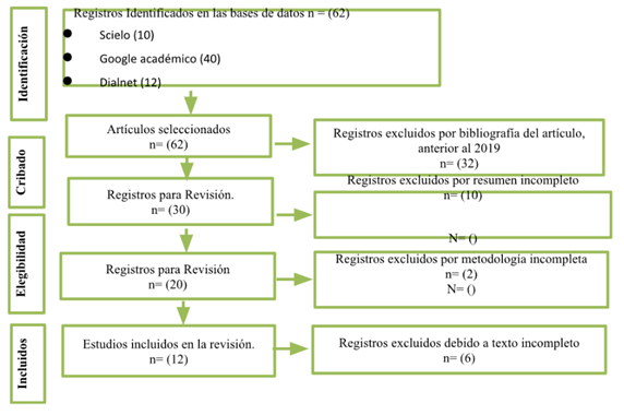 El proceso de selección de estudios siguió las directrices establecidas por PRISMA. Inicialmente, se identificaron 62 documentos potenciales, incluyendo artículos científicos. Posteriormente, se eliminaron los duplicados y se aplicaron los criterios de inclusión y exclusión, lo que redujo la selección a 12 publicaciones relevantes para el análisis final. Este proceso incluyó una revisión sistemática de los títulos, resúmenes y textos completos para garantizar que los documentos fueran pertinentes a los objetivos del estudio.