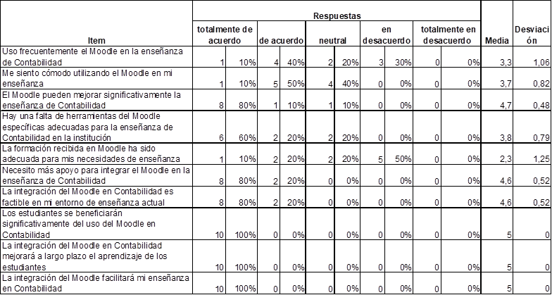Los resultados revelan una actitud altamente positiva hacia el potencial del Moodle para enriquecer el proceso educativo y su contribución a largo plazo en el aprendizaje de los estudiantes. Sin embargo, se identificaron áreas de oportunidad como la necesidad de fortalecer la formación en el Moodle y proporcionar más recursos y apoyo para su implementación. La uniformidad en algunas respuestas sugiere una fuerte convicción en los beneficios del Moodle, mientras que la variabilidad en otros indica una experiencia más diversa o necesidades diferentes entre los educadores. La tabla que aparece a continuación refleja las percepciones sobre el uso de del Moodle en la enseñanza de la Contabilidad. Se observa un fuerte consenso en torno al potencial positivo del Moodle, con tres ítems alcanzando la máxima media posible de 5 y desviaciones estándar de 0, lo que indica unanimidad entre los encuestados. Estos ítems son los beneficios para los estudiantes del uso del Moodle, la mejora a largo plazo del aprendizaje y la facilitación de la enseñanza.