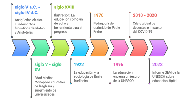 La línea de tiempo que se presenta a continuación surge como un producto directo de la exhaustiva recolección y análisis de datos obtenidos a partir de diversas fuentes académicas, históricas y oficiales relacionadas con la evolución de la educación y su función social en la sociedad. Este recurso cronológico permite visualizar de manera clara y estructurada los hitos más relevantes en la transformación del sistema educativo, desde sus orígenes hasta la actualidad, integrando tanto perspectivas internacionales como nacionales. A través de esta línea de tiempo, se busca facilitar la comprensión de los procesos históricos y sociales que han influido en la configuración de la educación moderna, evidenciando los cambios paradigmáticos, las continuidades y los desafíos que persisten en el ámbito educativo.
