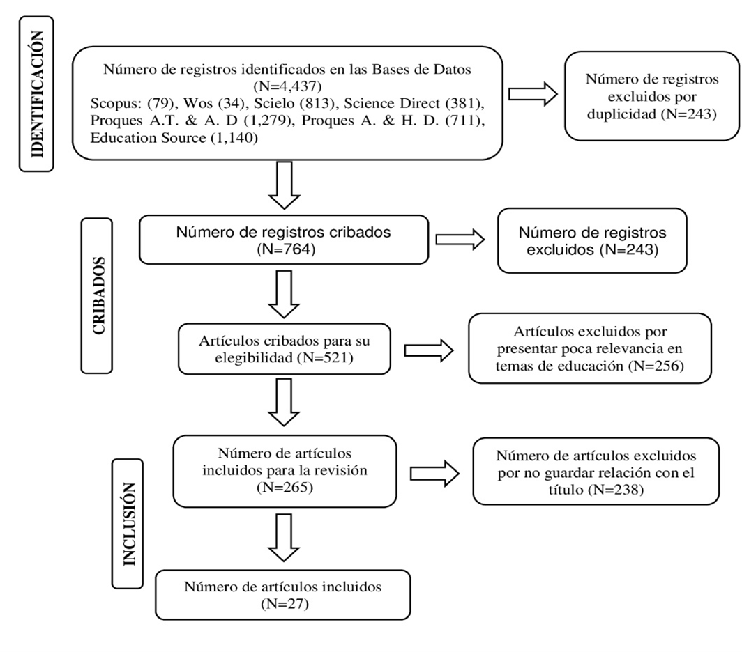 Cada etapa de selección incluyo un análisis crítico e interpretativo de los artículos revisados y alojados en las bases de datos elegidos por su confiabilidad, situando aquellos artículos que no cumplen con los requisitos de estudio, abordando discrepancias para no ser incluidos en el análisis, garantizando la relevancia y actualidad de los hallazgos de otros investigadores en temas de educación virtual. El proceso del flujograma de inicio con la revisión de 4437 estudio alojados en las bases de datos, siendo excluidos por duplicidad 243 artículos, los cuales se continuo con las exclusiones encontrándose artículos sin o poca relevancia y tan solo al final fueron incluidos 27 artículos que guardan relación con el título para ser analizados y sometidos a la interpretación y resultados.