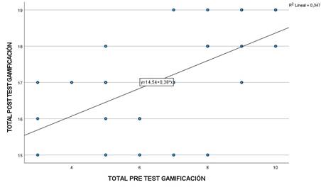 El análisis de regresión lineal revela una relación positiva y significativa entre las calificaciones iniciales y las posteriores a la intervención. Esto sugiere que los estudiantes con mejores resultados iniciales tienden a mantener un desempeño superior después de la intervención. Al mismo tiempo, el valor constante positivo del modelo apunta a una mejora general atribuible a la gamificación. Estos hallazgos respaldan la efectividad de la intervención y reflejan una tendencia consistente en los resultados obtenidos.