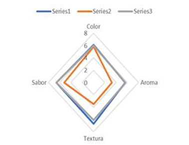 Se realizó la evaluación sensorial con la participación de un panel semientrenado (30 personas) quienes valoraron las características sensoriales: color, aroma, textura y sabor, mediante muestras codificadas, entregadas al azar, y evaluadas con la escala cuantitativa de la tabla 2.