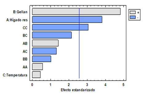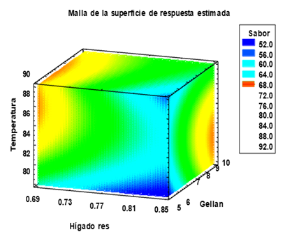 Aceptabilidad (y)= -2754,73 + 117,963(hígado res) + 30,7833 (goma gellan) + 63,2833 (temperatura) + 251,852 (hígado res)2 + 18,6667(hígado res x goma gellan) - 8,66667 (hígado res x temperatura - 0,413333(goma gellan2 - 0,42(goma gellan x temperatura) -0,313333(temperatura)2