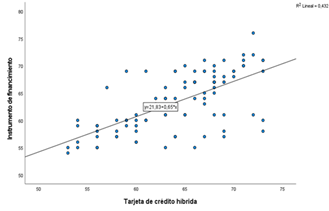 A continuación, en la Figura 1, se presentan los resultados estadísticos inferenciales: proceso de análisis e interpretación de datos, donde se establece una influencia positiva de la tarjeta de crédito hibrida en el instrumento de financiamiento para Clientes Mype de la Caja Municipal de Ahorro y Crédito - Cusco, además según el modelo de regresión lineal estimado (y = 21.83 + 0.65x) al aumentar en una unidad la tarjeta de crédito híbrida, el instrumento de financiamiento aumenta en promedio 0.65. De otro lado, el 43.2% (R2) de los cambios en el instrumento de financiamiento se debe a la influencia de la Tarjeta de Crédito Híbrida.
