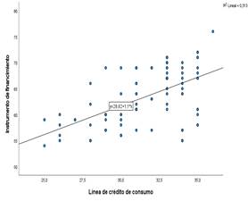 Así mismo, en la Figura 2 se observa el diagrama de Dispersión de la Línea de Crédito Consumo y el Instrumento de Financiamiento, y al interpretar los resultados, se establece una influencia positiva de la línea de crédito de consumo en el instrumento de financiamiento para Clientes Mype de la Caja Municipal de Ahorro y Crédito - Cusco, además según el modelo de regresión lineal estimado (y=28.62+1.1x), al aumentar en una unidad la línea de crédito de consumo, el instrumento de financiamiento aumenta en promedio 1.1. De otro lado el 31.3% (R2) de los cambios en el instrumento de financiamiento se debe a la influencia de la línea de crédito de consumo.