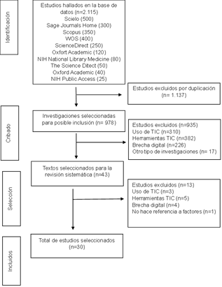Se revisaron 2,115 artículos en las bases de datos, y se seleccionaron y excluyeron los que no cumplían con los criterios de inclusión. La muestra para esta investigación se basó en la revisión de artículos relacionados con el tema de estudio, que incluyen publicaciones de los últimos cinco (5) años, enfocadas en los factores que limitan el uso de las TIC en adultos mayores, de acceso abierto, en inglés o español, y con palabras clave como uso de TIC, herramientas TIC y brecha digital. Se utilizó el método PRISMA para la sistematización bibliográfica, que permite documentar de forma transparente el propósito y los hallazgos principales de la revisión.