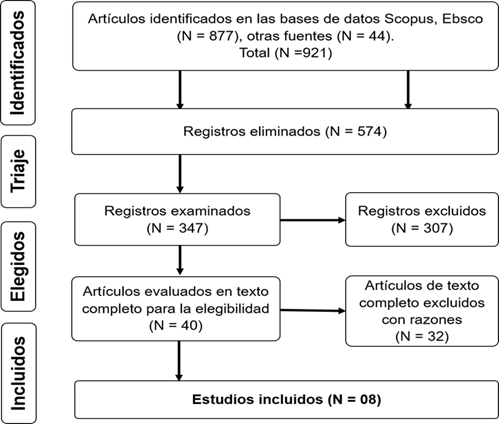 Para analizar los artículos seleccionados se tuvo en cuenta revistas del campo educativo, en el primer filtro se detectó ochocientas setenta y siete (877), documentos de la base de datos de Scopus, Ebsco y cuarenta y cuatro (44) de otras fuentes, se realizó el triaje quedando trescientos cuarenta y siete (347) artículos, en el segundo filtro se consideró descriptores o palabras clave empleadas en el resumen, quedando en total cuarenta (40), en el tercer filtro se eligió ocho (8) artículos de revisión sistemática de la literatura y con acceso abierto, procurando que el contenido esté lo más actualizado posible y en función a los objetivos de esta investigación.