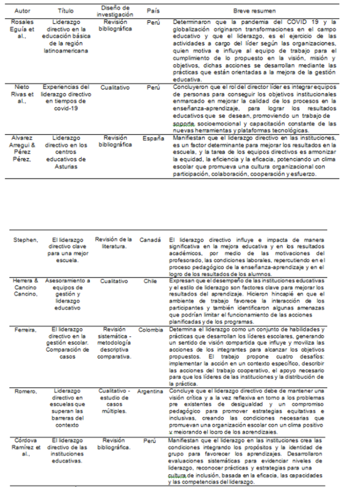 En la revisión de estos artículos de liderazgo directivo se distingue la necesidad de lograr una gestión eficaz en las instituciones educativas es uno de los mayores retos y compromisos que enfrenta la administración educativa, promoviendo e incentivando el trabajo colaborativo docente para mejorar la calidad de los aprendizajes. Por último, los artículos incluidos en la revisión sistemática fueron desarrollados entre los años 2010 al 2022, estudios desarrollados que se localizan en países de Argentina, Canadá, Chile, Colombia, España y Perú.