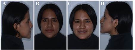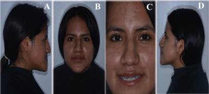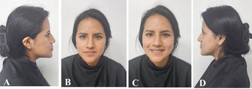 Figura 1 Fotografías extraorales A: Lateral derecho B: Frontal C: Tercio medio y tercio inferior D: Lateral Izquierdo