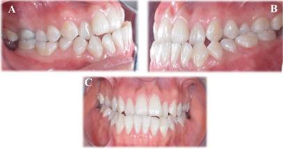 Figura 2 Fotografías intraorales A: Oclusión Vista lateral derecha B: Oclusión Vista lateral izquierda C: Oclusión vista frontal