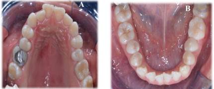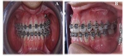 Figura 4 Fotografías intraorales post colocación de tratamiento ortodónticos A: Oclusión vista frontal B: Oclusión vista lateral izquierda.