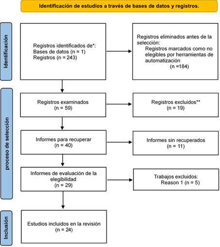 Se organizó en un simple cuadro la cantidad de artículos obtenidos en las bases de datos utilizados. Siendo únicamente Scopus en el cual se obtuvo 243 sin algún tipo de clasificación. Luego de ello se utilizó un proceso de búsqueda en la cual se usaron las características de inclusión y exclusión previamente mencionados. Además, llegado a la selección por elegibilidad, se procedió a evaluar los artículos para el contexto y objetivo del trabajo. Para finalizar con la inclusión de artículos para la revisión sistemática de literatura (Ver Figura 1).