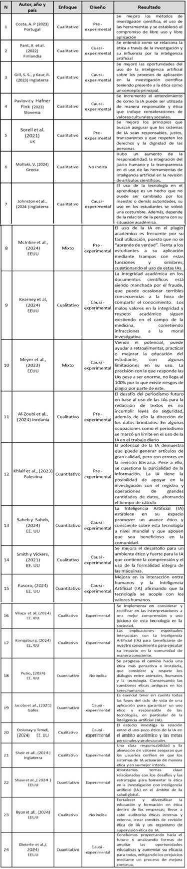 Por último, el trabajo de Sallam (2023) se tuvo que descartar por centrarse de manera fija a la especialización del área médica, haciendo hincapié en virtudes en relación al campo de la medicina. Después de la revisión y exclusión de los artículos mencionados, el trabajo a realizar cuenta con 24 artículos para el uso. Estos artículos se organizaron en una tabla con los datos importantes para el estudio y su validación (Ver Tabla 2).