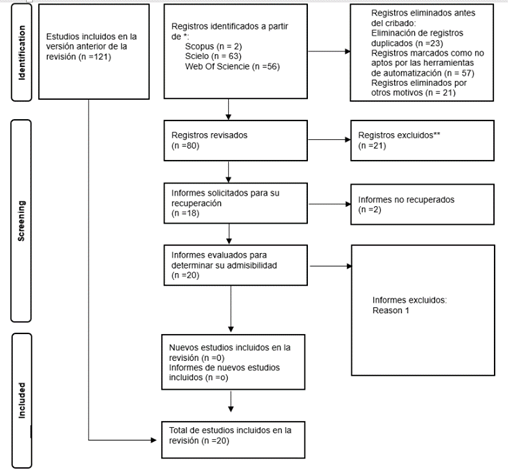 En la Figura 1, el diagrama PRISMA proviene de la base de datos Scopus (2), Scielo (63), y Web of Sciencie (56). Identificando 121 documentos. Tras eliminar duplicados; además de aquellos que no cumplen con el criterio de inclusión y exclusión. Finalmente, por elegibilidad fueron 20 los documentos elegidos. El diagrama visualiza el proceso, desde la identificación inicial de estudios hasta la selección final de aquellos que aportarán evidencia sólida para responder a la pregunta de investigación planteada.