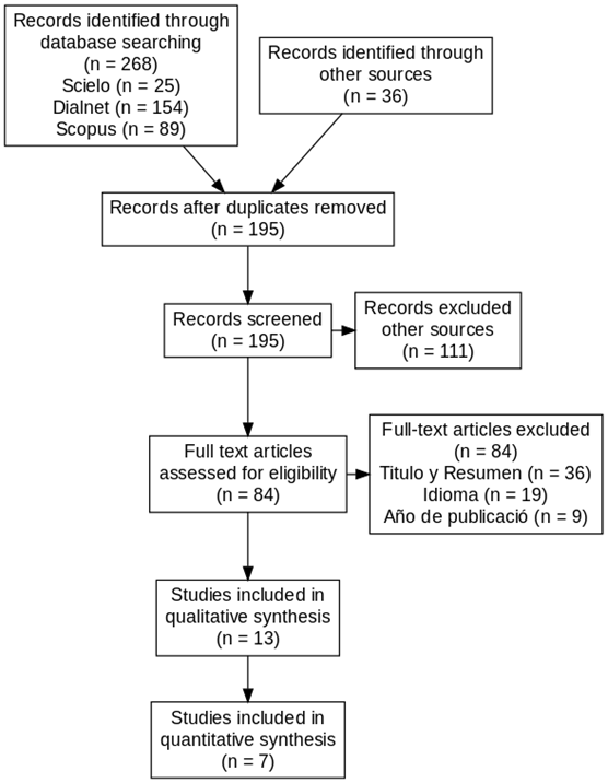 Como resultado del proceso de búsqueda en las bases de datos científicas, se identificaron un total de 84 artículos originales publicados entre 2018 y 2023, distribuidos de la siguiente manera: 25 artículos en SciELO, 34 en Dialnet y 25 en Scopus. A partir de estos resultados, se llevó a cabo un primer filtro de revisión para eliminar documentos duplicados, lo que redujo la cantidad a 35 artículos. Posteriormente, se aplicaron criterios de inclusión y exclusión con el propósito de evaluar la alineación de los estudios con el objetivo de la revisión sistemática. Finalmente, tras este segundo proceso de filtrado, se seleccionaron 20 artículos que cumplieron con todos los criterios establecidos.