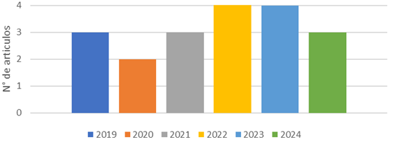 Los artículos científicos seleccionados abarcan un periodo de publicación desde el año 2019 hasta el 2024. A continuación, se presentará la cantidad de artículos utilizados por cada año, plasmada en la Figura 3. Esta distribución temporal permite visualizar cómo la investigación sobre el juego como estrategia pedagógica ha evolucionado en los últimos años, reflejando un interés creciente en su aplicación para mejorar el aprendizaje significativo y el desarrollo integral de los estudiantes.