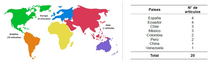Además, en cuanto a las ubicaciones geográficas de los artículos científicos seleccionados, los 20 artículos en total son originarios de naciones latinoamericanas. La distribución de los artículos por país se ilustra en la Figura 5. Esta concentración de artículos en la región latinoamericana refleja la importancia creciente de la investigación en esta área y la colaboración entre países de la región.