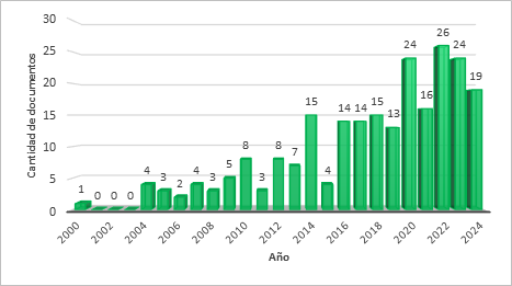 Para el análisis bibliométrico, se consideraron los trabajos publicados entre 2000 y 2024 relacionados al uso de juegos matemáticos en el aula para la enseñanza de matemáticas. La Figura 1 muestra que la productividad académica sobre este tema ha ido en constante aumento. Como resultado, la tasa de publicación máxima se produjo entre 2016 y 2024, con 165 publicaciones que reflejan el 71.1% de la producción total.