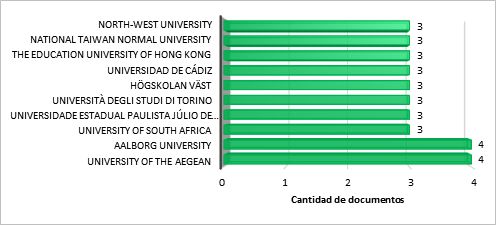 En la Figura 2 se evidencia las universidades con mayor número de publicaciones relacionado a los juegos matemáticos en educación matemática. Las dos primeras universidades, la University of the Aegean y Aalborg University, tiene 4 publicaciones cada una. La segunda posición es para la University of South Africa, seguida de la Universidade Estadual Paulista Júlio de Mesquita Filho y Università degli Studi di Torino, cada una con 3 publicaciones académicas.