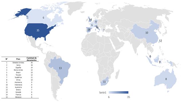 Según la Figura 3, de los 15 países que han contribuido a la producción científica, Estados Unidos ha publicado 35 documentos, lo que representa el 15.1% del total. Esto la convierte en la nación que más ha investigado sobre el tema. Italia ocupa el segundo lugar con 16 estudios (6.9% del total) y España el tercero con 14 investigaciones (6% del total). Además, entre las tres lenguas principales para la escritura académica, el inglés representa el 89.7%, el español el 6.9% y el portugués el 3.4%.