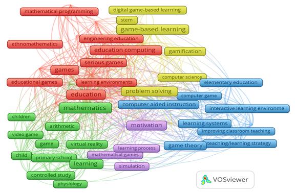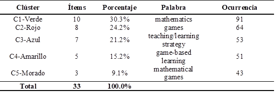 A partir del recuento de palabras en títulos, resúmenes y listas de palabras clave, las publicaciones revisadas se sometieron a un análisis de co-ocurrencia de palabras clave con un nivel de 4 (n ≥ 4). Las palabras clave más comunes fueron “mathematics”, “games”, “game-based-learning”, “mathematical games” y “teaching/learning strategy” Se establecieron cinco categorías para los 33 elementos, como se muestra en la Figura 4.