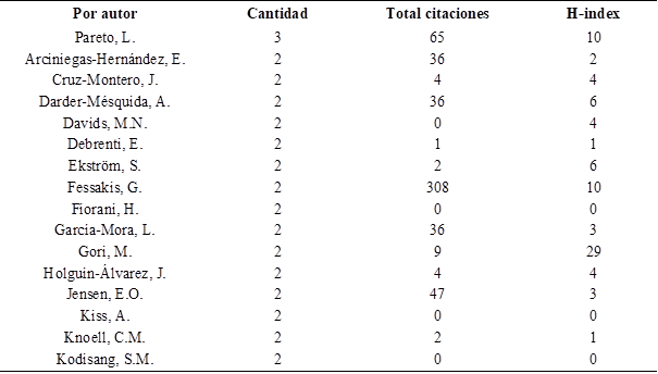 Por otro lado, se identificaron un total de 149 investigadores destacados relacionados con el uso de juegos matemáticos, procedentes de diversas instituciones académicas. En la tabla 1 figuran los escritores con mayor número de publicaciones y citas: entre los autores más relevantes, Fessakis, G. ocupa el primer lugar con 2 publicaciones y 308 citas; Pareto, L. se encuentra en segundo lugar con 3 publicaciones y 65 citas y el tercer puesto es para Jensen, E.O., que tiene 2 publicaciones y 47 citas.