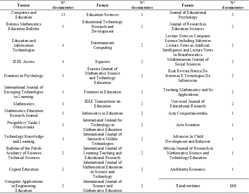Las principales revistas que se tuvieron en cuenta para esta investigación se muestran en la Tabla 2. Con 12 publicaciones sobre este tema, Computers And Education es la principal fuente en este campo. Le sigue Bolema Mathematics Education Bulletin, con 5 publicaciones. Asimismo, la relevancia de estas revistas queda demostrada por su posición en los dos cuartiles superiores de los factores de impacto de sus respectivas disciplinas.
