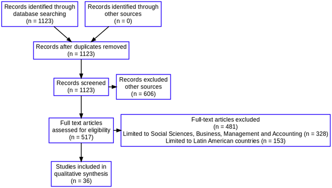 De un total inicial de 1,123 registros identificados, tras eliminar duplicados y aplicar criterios de exclusión tanto temáticos como geográficos, se evaluaron a texto completo 517 artículos. Finalmente, 36 estudios cumplieron con todos los criterios de inclusión y fueron incorporados en la síntesis cualitativa. Este riguroso proceso garantiza que los estudios seleccionados sean pertinentes, actuales y de alta calidad académica, asegurando así la validez y confiabilidad de los resultados obtenidos.