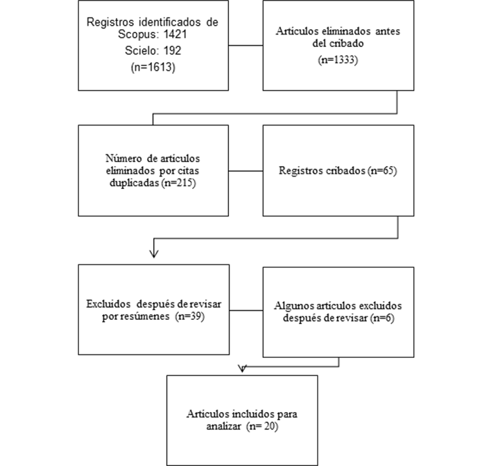 Entre los criterios de exclusión se descartaron artículos con acceso restringido, resúmenes de conferencias, así como capítulos de libros, al no cumplir con los estándares de calidad y profundidad requeridos para el análisis. Como resultado de la búsqueda, se identificaron 1,421 artículos en la base de datos Scopus y 192 en SciELO. Tras aplicar los criterios de selección, se seleccionaron 8 artículos de Scopus y 12 de SciELO, lo que dio como resultado un total de 20 artículos analizados para los fines del presente estudio.