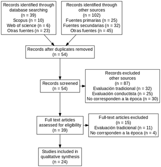 El desarrollo de la revisión siguió las cuatro fases propuestas por Codina (2018): búsqueda, evaluación, análisis y síntesis. En la fase de búsqueda, se consultaron bases de datos especializadas como Dialnet, Google Académico, Scopus y Web of Science. Para la localización de documentos relevantes se utilizaron palabras clave tales como “evaluación”, “evaluación auténtica”, “evaluación basada en competencias”, “evaluación basada en desempeños” y “evaluación formativa”. Se establecieron filtros de selección que incluyeron publicaciones en inglés y español, estudios publicados entre los años 2000 y 2024, y artículos científicos originales o de revisión, así como libros especializados. Se excluyeron tesis, literatura gris y documentos sin validación académica formal.