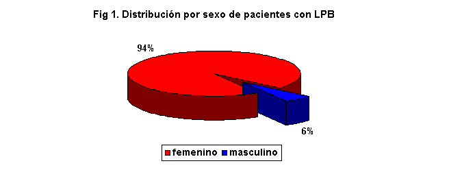 Se estudiaron 18 pacientes con diagnóstico de LPB de los cuales 17 correspondieron al sexo femenino (94,4%) y 1 sólo caso masculino (5,6%). Una relación M/H 17:1 (Fig.1).