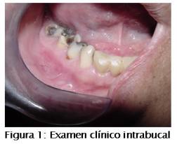 Al examen clínico intrabucal se observó caries avanzadas en primer molar, primer y segundo premolar inferior derecho (46, 45, 44). No se observaron tumefacciones, ni expansión alveolar. (Figura 1)