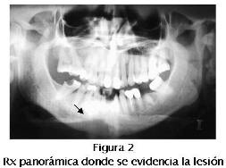 Al examen radiográfico se observó una imagen radiopaca de bordes irregulares, de aproximadamente 2 cm de diámetro, situada entre las raíces del canino, primer y segundo premolar inferior derecho, rodeada de una banda radiolúcida angosta y en vecindad con el agujero mentoniano. También se observaron imágenes radiolúcidas circunscritas, asociadas a los ápices radiculares del primero y segundo premolar inferior derecho, compatibles con procesos infecciosos periapicales. (Figura 2)