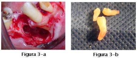 Figura 4: Abordaje quirúrgico de la lesión. Nótese la gran cantidad de dentículos presentes (3, b-c)
