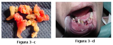 1) Previa interconsulta con hematólogo para tratamiento de anemia crónica, se procedió bajo anestesia local troncular e infiltrativa a la extirpación quirúrgica de lesión calcificada y posterior estudio histopatológico. Se pudo observar que la misma estaba íntimamente relacionada con el agujero mentoniano. (Figura 3, a-b-c-d)