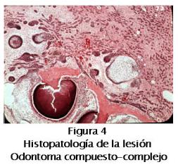 Desde el punto de vista histopatológico los odontomas complejos se caracterizan por dentina primaria fundamentalmente, esmalte calcificado e hipocalcificado, cemento inmaduro y una cápsula. Por otra parte, los odontomas compuestos presentan pulpa, dentina primaria, esmalte hipocalcificado, cemento primario y un trabeculado óseo entre los dentículos. Existen formas mixtas con morfología intermedia.11