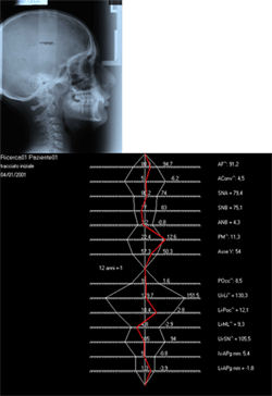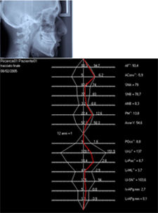 La radiografía panorámica evidencia la presencia de todos los elementos dentarios, inclusive los gérmenes dentarios de los terceros molares. El análisis cefalométrico revela una discrepancia esquelética sagital, con un ANB de 5, un perfil óseo ligeramente convexo y un patrón de crecimiento braquifacial. Por otra parte se realizó una clasificación de crecimiento del paciente, determinando que el mismo pertenece a una categoría auxológica 5 y tipo rotacional identificado como A1NN (segun Petrovic)(9,10), en donde A representa la rotación anterior de la mandibula, 1 indica la proporción de crecimiento entre el maxilar superior y la mandibula constante, N indica una relación sagital normal entre los maxilares y N indica una relación vertical normal entre los maxilares (Normal-bite). Las bases de los maxilares (superior e inferior) tienen una longitud media. Los incisivos superiores e inferiores muestran una inclinación adecuada respecto a las bases óseas. (Fig. 5, a-b)