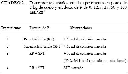 Se utilizaron técnicas isotópicas a objeto de identificar y cuantificar la procedencia del P absorbido por el maíz, Zea mays L., después de la incorporación conjunta de RFR y SFT. El procedimiento básico empleado ha sido previamente descrito por Zapata y Axmann (1995), preparando una solución que contenía 32P y 31P en proporciones tales que 50 mL de la misma aportara 7,4 MBq de 32P y una dosis equivalente de portador (31P) de 5 mgP kg-1 en la forma de KH2PO4. Esta solución marcada con 32P contenía una actividad de 0,148 MBq mL-1. En el experimento en potes de 2 kg de suelo se establecieron cuatro tratamientos como se describe en el Cuadro 2. Las unidades experimentales fueron dispuestas según un diseño de bloques al azar con tres repeticiones.