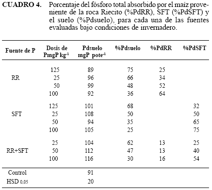 La cantidad de P absorbida por la planta proveniente de la RFR en la mezcla RFR+SFT se obtuvo al restar la cantidad de P derivado del SFT en la mezcla, obtenido en el tratamiento 4, del P absorbido proveniente de la mezcla RFR+SFT, obtenido en el tratamiento 3. De igual forma, se obtuvieron los porcentajes de P absorbido por la planta proveniente del suelo (%Pdfs), la RFR (%Pdfr) o el SFT (% Pdff); para ello se dividieron las cantidades de P absorbidas provenientes de cada fuente, entre la cantidad total absorbida por la planta en cada tratamiento.