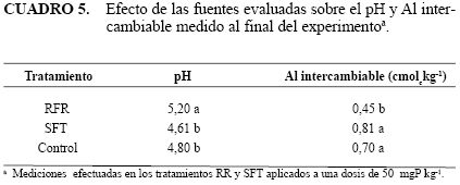El hecho de que la combinación de ambas fuentes haya favorecido relativamente más la absorción de P proveniente de la fuente soluble en comparación con la fuente insoluble, sugiere que la RFR podría contribuir a mejorar la disponibilidad de P del SFT o su eficiencia de uso. Trabajos previos han indicado que aplicaciones de RF pueden mejorar la disponibilidad de P soluble al reducir la capacidad de fijación de P del suelo (Mokwunye y Chien, 1980). A pesar de no existir, en el presente estudio, diferencias en el pH del suelo entre los tratamientos RFR+SFT y el control, los resultados indicaron una disminución significativa del contenido de Al intercambiable en el suelo para el tratamiento RR+SFT (Cuadro 5), ello sugiere una posible reducción de la capacidad de fijación de P al combinar RFR con SFT.