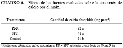 El valor agronómico de las RF de mediana y alta reactividad como fuentes de calcio ha sido ampliamente reconocido, especialmente en suelos ácidos con alta saturación de Al ( Hellmuns et al., 1989, Xiong et al., 1996). En el presente estudio, a pesar de que una cantidad significativa de Ca fue incorporada como SFT (12,5 - 50 mg Ca kg-1), el cultivo mostró una mayor absorción del elemento en el tratamiento RFR+SFT, en comparación con el tratamiento que recibió sólo SFT (Cuadro 6). Esta respuesta positiva a una mayor suplencia de Ca en el tratamiento RFR+SFT hace factible la inferencia de que un mejor estado nutricional de la planta haya contribuido también a una mejor utilización del SFT.