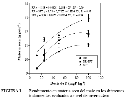 La incorporación conjunta de RFR y SFT en relación 1:1 aumentó significativamente, en un 10 %, la materia seca producida en comparación a la RFR sola (RFs, Figura 1). Un comportamiento cuadrático para la respuesta del cultivo a las diferentes dosis de las fuentes sugiere que el rendimiento máximo potencial estuvo influenciado por la fuente de P utilizada. Mientras que en el caso de los tratamientos RFR y RFR+SFT el máximo rendimiento fue alcanzado a partir de la dosis de 50 mgP kg-1, se observó una respuesta creciente para el SFT en el mismo rango. Lo anterior sugiere una respuesta positiva a la disponibilidad de P y confirma observaciones previas las cuales destacan la influencia de la solubilidad de la fuente en el crecimiento temprano y la absorción de P por el maíz en suelos altamente deficientes en P (Salas, 1995).