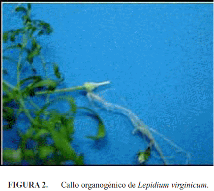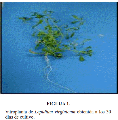 Los microresquejes de L. virginicum L., se obtuvieron a partir de plantas de tres meses de edad mantenidas en condiciones de vivero. Estas plantas fueron asperjadas dos veces por semana durante dos semanas con un fungicida de uso comercial marca Horticol® (10 mg l-1). El medio de cultivo que se utilizó fue el de Murashige y Skoog 1962 (MS), enriquecido con vitaminas: tiamina (5 mg l-1), mio-inositol (100 mg l-1), sacarosa (30 g l-1), suplementado con: Medio A: 1 mg l-1 BA, Medio B: 1 mg l-1 BA+ 1 mg l-1ANA, Medio C: 2 mg l-1 BA + 1 mg l-1ANA. El agente gelificante utilizado fue agar (8 g l-1), pH 5.8. Treinta explantes fueron incubados en el cuarto de crecimiento a 25 ± 1 ºC bajo luz blanca fluorescente continua. Los explantes fueron sub-cultivados a medio fresco cada 21 días. La eficiencia del sistema de regeneración ¨in vitro¨ establecido fue medida por el índice de formación de brotes (Trujillo, 1994); los cálculos se efectuaron a los 30 y 60 días de haberse iniciado el cultivo.