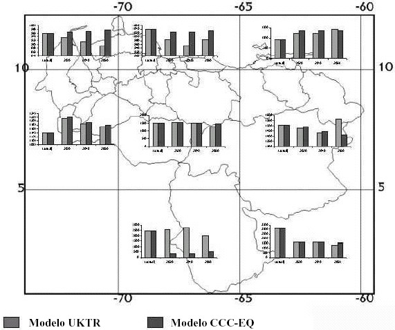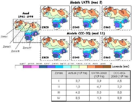 Se calculó la distribución geográfica de la media anual de precipitación y temperatura para cuatro períodos (actual, 2020, 2040 y 2060), utilizándose información derivada del trabajo de Martelo (2004). Considerando los escenarios de cambio climático en el país definidos por Martelo (2004), se establecieron tres áreas geográficas de mayor afectación (Ovalles et al., 2005): Oriental (Sucre, Monagas, Anzoátegui, Bolívar y Delta Amacuro), Centro Occidente (Aragua, Carabobo, Miranda, Yaracuy y norte de Guárico) y la zona de los Andes y Cuenca del Lago de Maracaibo (Costa Oriental y Sur del Lago). Estas áreas fueron definidas básicamente con relación a la disminución de la precipitación anual, encontrándose también cambios en la cantidad de meses húmedos y temperatura. Ellas fueron subdivididas de acuerdo al grado del cambio climático esperado, cada una de estas subáreas fueron consideradas como las unidades de tierras (UT).
