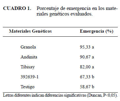 Materiales Genéticos Emergencia (%) Granola 95,33 a Andinita 90,67 a Tibisay 82,00 a 392639-1 67,33 b Testigo 58,67 b Letras diferentes indican diferencias significativas (Duncan, P<0,05).