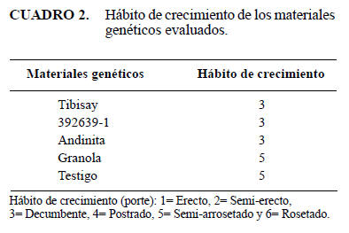 Para las variedades Tibisay, Andinita y el clon 392639-1 el porte fue decumbente, coincidiendo con los resultados de Quintero et al. (2009). Cabe señalar que las plantas con este porte permiten una mayor densidad poblacional y facilitan las labores culturales en campo.