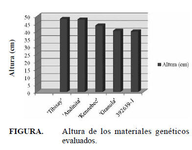 Además, otra de las variables evaluadas fue la altura de las plantas, cuyo valor osciló entre 39,90 y 48,14 cm (ver Figura). En torno a Tibisay y Andinita, alcanzaron una altura significativamente superior al testigo (43,76 cm), con valores de 47,80 y 48,18 cm, respectivamente; variedades que sobresalen al resto de los materiales, porque poseen mayor área para la producción de carbohidratos y una alta capacidad de acumular energía, por consiguiente, cumple con los procesos fisiológicos en cada una de las fases fenológicas del cultivo.