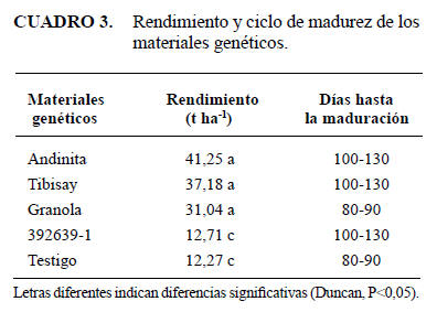 El rendimiento de las variedades Andinita, Tibisay y Granola fue estadísticamente superior al testigo, con valores de 41 t ha-1, 37 t ha-1 y 31 t ha-1, respectivamente (Cuadro 3).