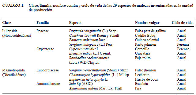 Con el inventario general, se determinó un total de 29 especies pertenecientes a 17 familias (Cuadro 1), de las cuales, en lo que respecta a su ciclo de vida, el 86,21% estuvo representado por plantas anuales y 13,79% por plantas perennes.
